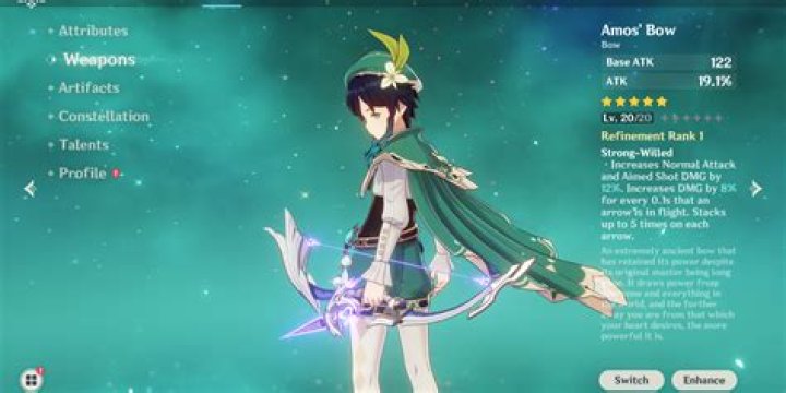 The Stringless bow not only increases his Elemental Mastery, but it also boosts his Elemental Skill and Elemental Burst DMG. Fully refined, the free-to-play item can be many players' best choice.Who can I use Amos bow on?