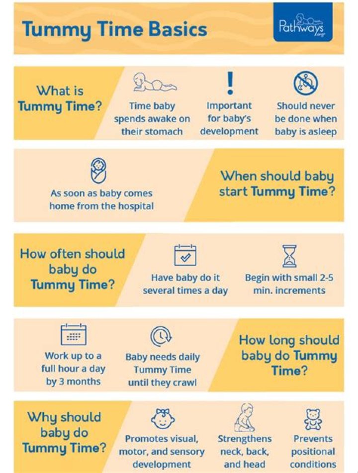 Start with just a few minutes at a time, a couple times a day. Build up to longer and more frequent sessions. When you first bring your baby home from the hospital, the American Academy of Pediatrics recommends 2 to 3 tummy time sessions a day for 3 to 5 minutes at a time. That's a total of about 15 minutes per day.