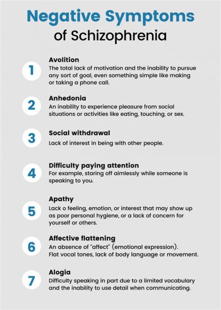 The negative symptom domain consists of five key constructs: blunted affect, alogia (reduction in quantity of words spoken), avolition (reduced goal-directed activity due to decreased motivation), asociality, and anhedonia (reduced experience of pleasure).What are the top 10 signs of schizophrenia?