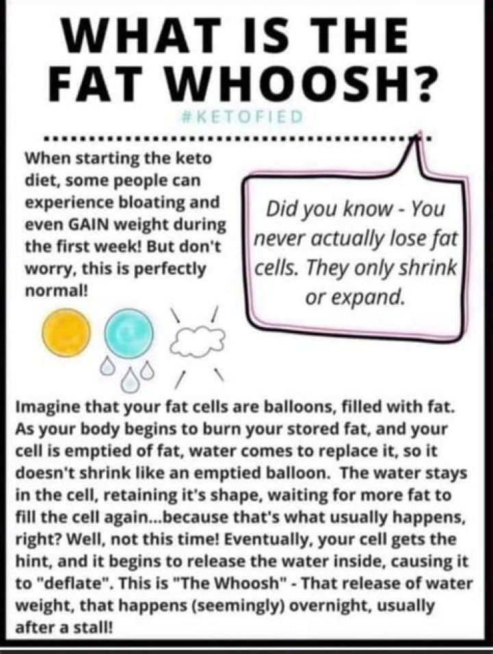 Keto dieters say the fat on their body feels jiggly or soft to the touch. The concept of the whoosh effect is if you stay on the diet long enough, your cells start to release all the water and fat they've built up. When this process begins, this is called the “whoosh” effect.