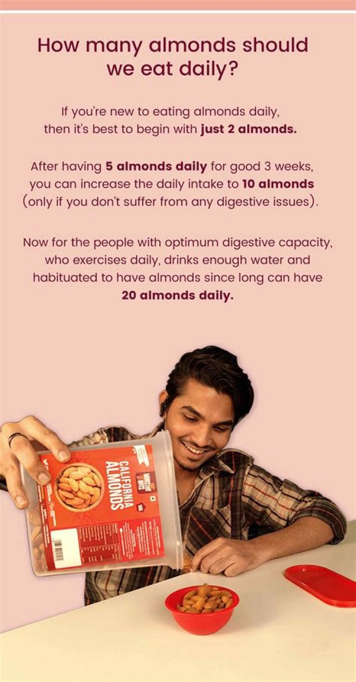 Depending on which health outcome you're searching for, a mere 10-60g of almonds (the range used in the aforementioned studies) incorporated into your diet can ameliorate type 2 diabetes, cardiovascular disease, eye issues, and many other health conditions.Can I eat almonds at night?
