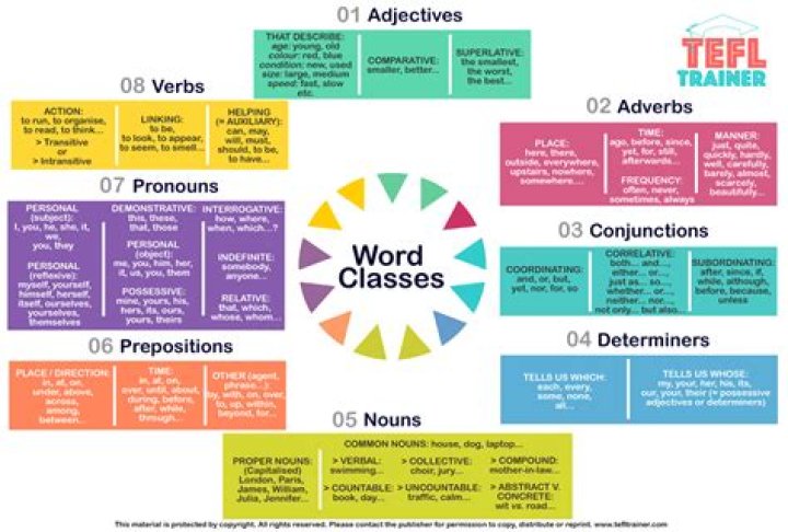 There are eight types of words that are often referred to as 'word classes' or 'parts of speech' and are commonly distinguished in English: nouns, determiners, pronouns, verbs, adjectives, adverbs, prepositions, and conjunctions.What are the 7 word classes?