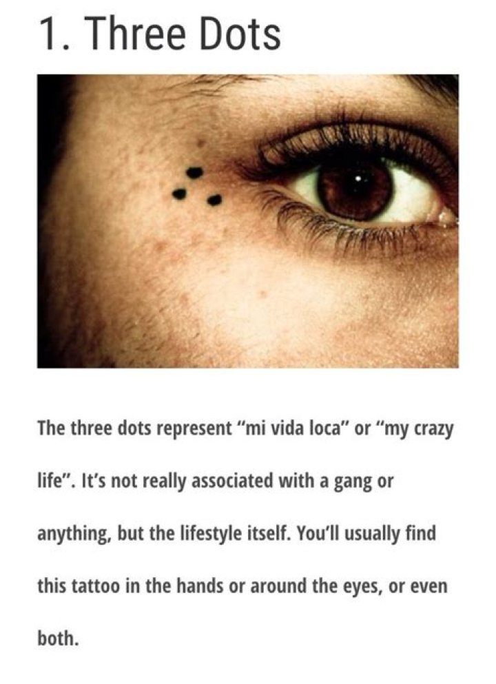 Dot tattoos beneath the eye have been commonly used in Western culture to symbolize allegiance to gang life. Tattoo's showcasing three dots beneath the eye have become synonymous with the saying “mi vida loca” or “my crazy life”.